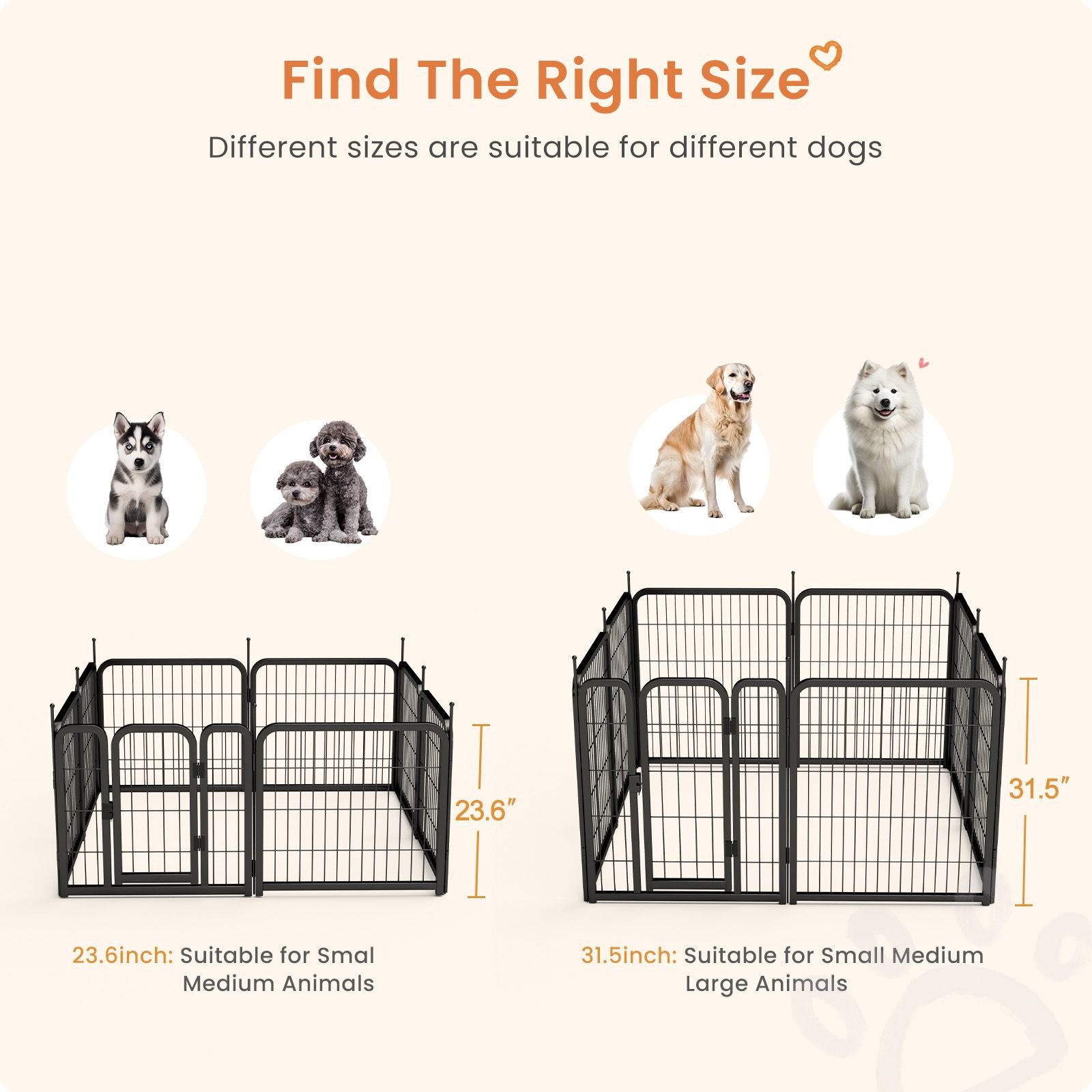 No tools required: all you need to do is unfold this dog play pen and connect them via metal bars, and within seconds you will have a dog fence with no extra effort, while when you don't apply them you can fold them up for easy storage or travel without taking up space!