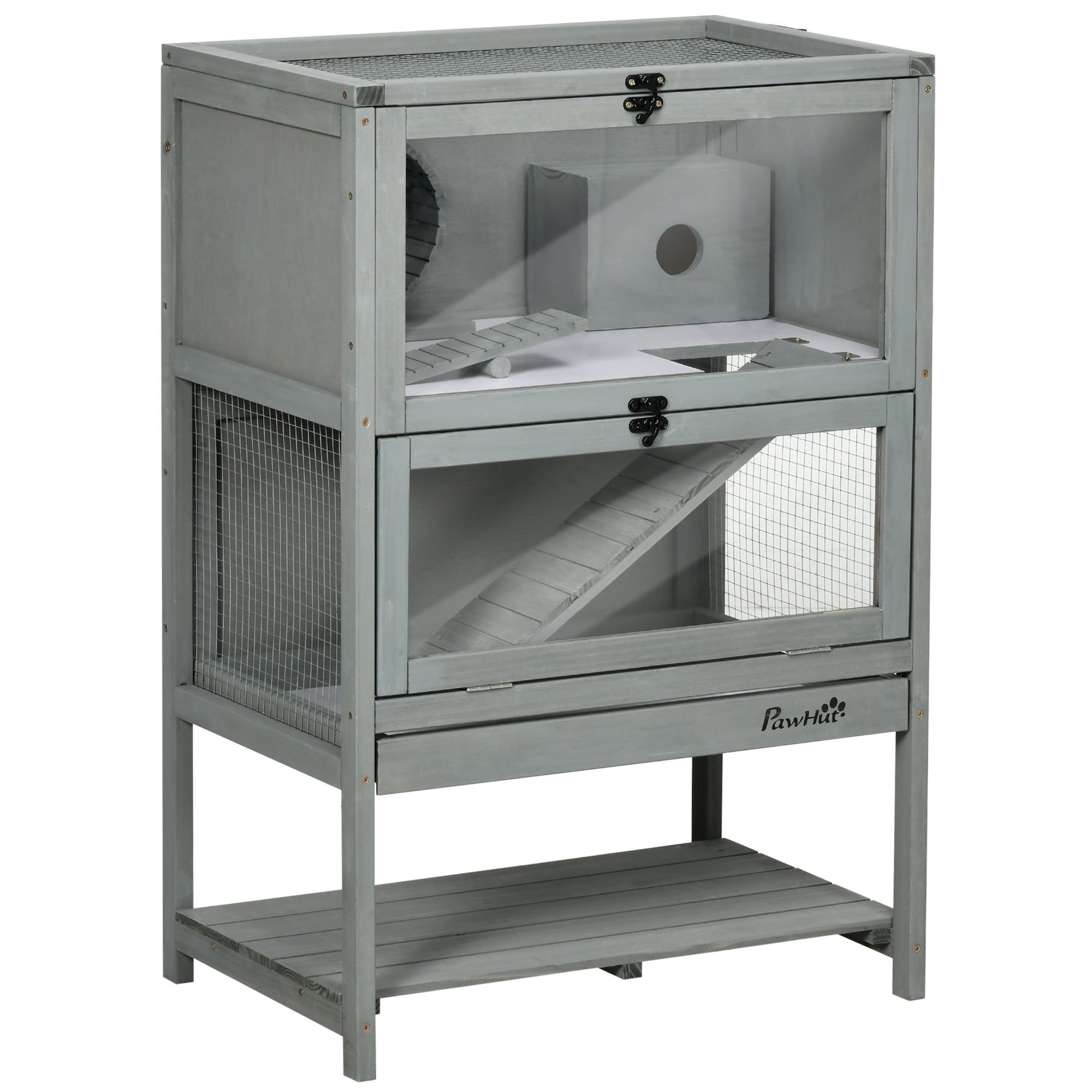 Large: With a capacity that holds a pair of two animal friends, this play cage for hamster pets provides room to run, scamper, and take off, allowing space to account for energy and exercise. Featuring toys galore, the hamster habitat contains a seesaw, wheel, ramp, and hut. Spot your little guy mid-drop of the seesaw, mid-ladder, or catching a drink of water after the fun. This hamster playhouse provides not only a large, expansive design, but activities to enjoy.