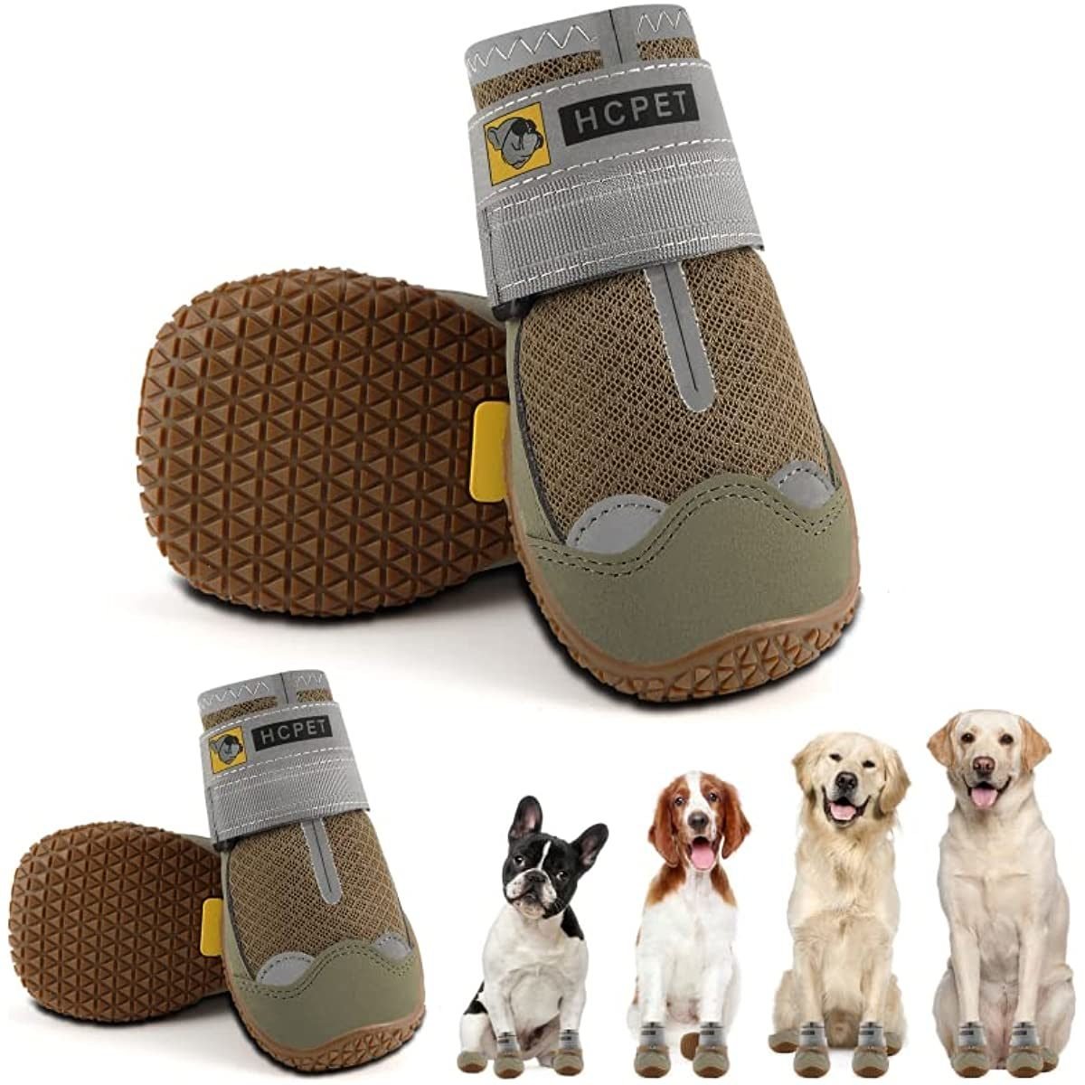 Size 4 : Width 2.16 inch for 36-43 lbs. Great for Japanese Akita; Collie; American Cooker Spaniel; French Bulldog etc. Please refer to the picture size chart; choose the right size for your puppy. Anti-Slip Boots for Dogs : Dog booties are soft to paws; doggy shoes effectively protect dog claws from sharp thorns; hot pavement and glass. The paw wear can help dogs to stand up on hardwood floors easier Adjustable Dog Hiking Boots : Easy to put on / off; Hcpet dog shoes are fastened firmly by 3M reflective straps; which enhance visibility helping your pet dog walk safely at night Breathable Paw Protection For Dogs : Prevent damage done from your dog's nails to your home; hardwood floor; vehicles and visitors. Great for wound and injury protection during activity and rest time. Prevent chewing and licking without overheating New Friend Dog Paw Shoes : Don't worry when your dogs start to walk with new shoes but not in a normal pace even prance. You can try to encourage and guide your love dog to adapt to Hcpet dog boots