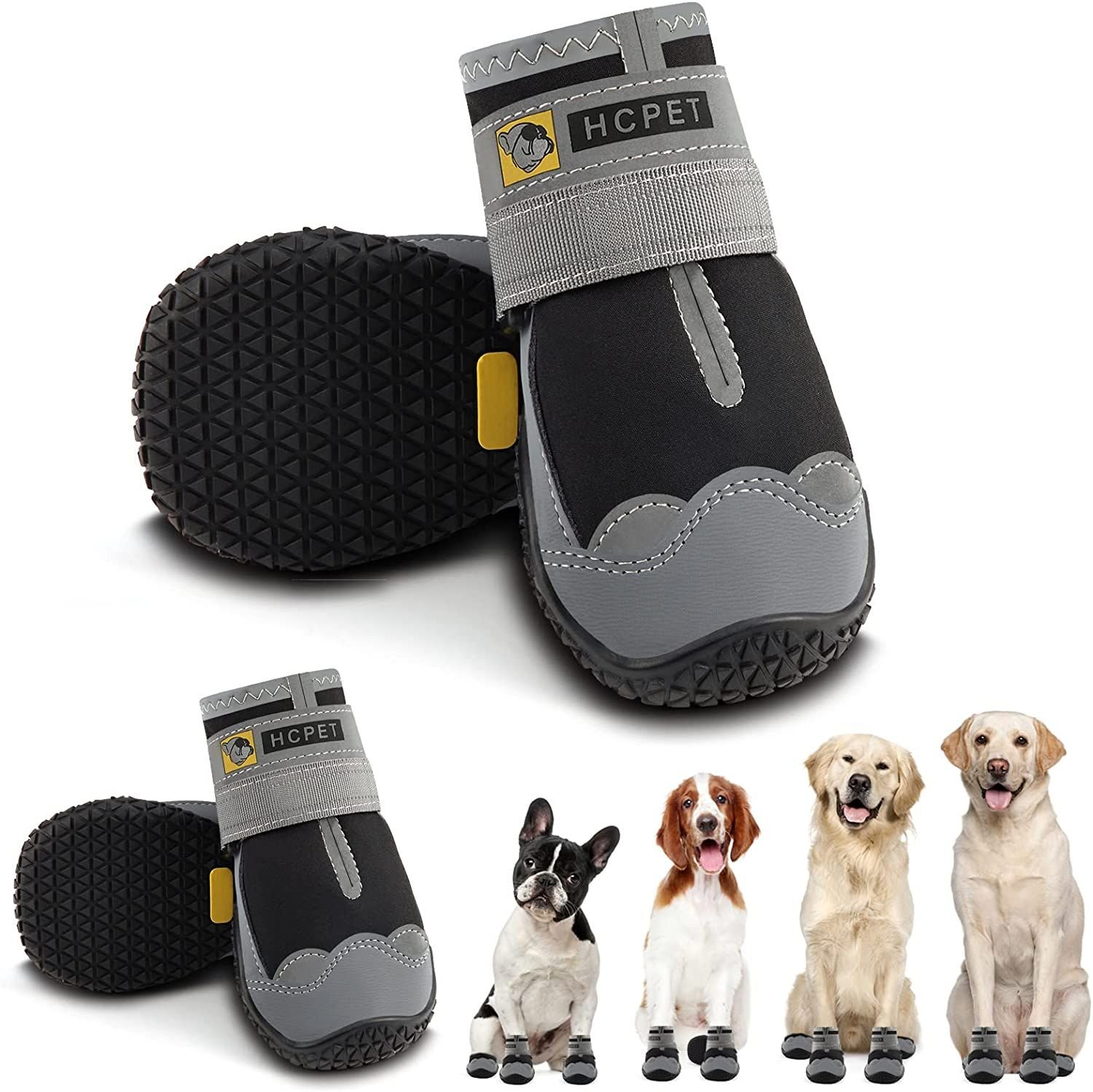 Size 4 : Width 2.16 inch for 36-43 lbs. Great for Japanese Akita; Collie; American Cooker Spaniel; French Bulldog etc. Please refer to the picture size chart; choose the right size for your puppy. Anti-Slip Boots for Dogs : Dog booties are soft to paws; doggy shoes effectively protect dog claws from sharp thorns; hot pavement and glass. The paw wear can help dogs to stand up on hardwood floors easier Adjustable Dog Hiking Boots : Easy to put on / off; Hcpet dog shoes are fastened firmly by 3M reflective straps; which enhance visibility helping your pet dog walk safely at night Breathable Paw Protection For Dogs : Prevent damage done from your dog's nails to your home; hardwood floor; vehicles and visitors. Great for wound and injury protection during activity and rest time. Prevent chewing and licking without overheating New Friend Dog Paw Shoes : Don't worry when your dogs start to walk with new shoes but not in a normal pace even prance. You can try to encourage and guide your love dog to adapt to Hcpet dog boots