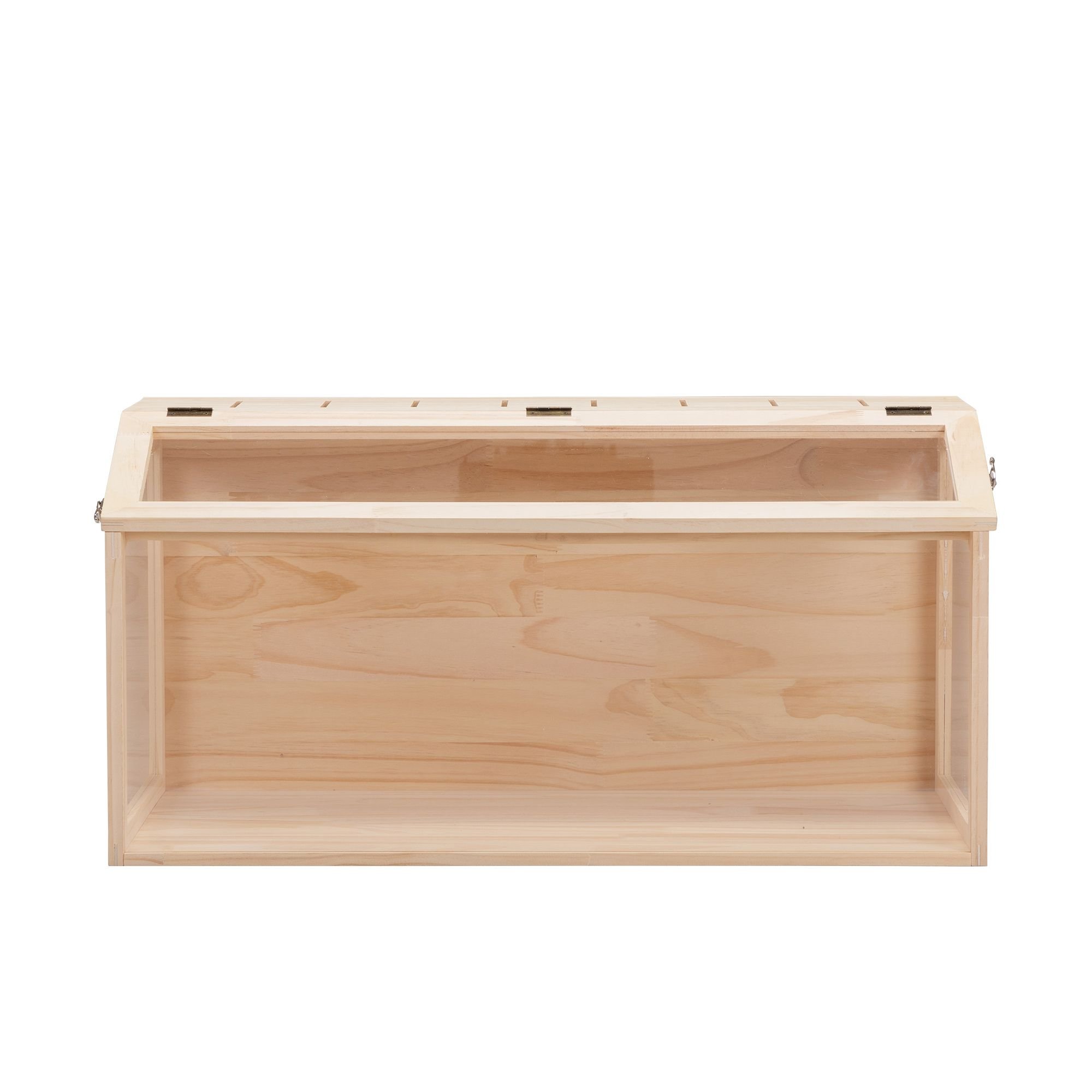 Specification:Color: BurlywoodMaterial: Pine + Plastic + Wire MeshOverall Dimensions: 31.5"L x 16.15"W x 15.75"HFront Acrylic Plate Size: 30.31"L x 12.16"W x 0.08"T Side Panels Size: 15.16"L x 15.16"W x 0.6"TBackboard Size: 31.1"L x 15.2"W x 0.47"TBase Plate Size: 30.2"L x 15.2"W x 0.47"TWeight Capacity: 33 lbsNet Weight: 14.10 lbsNote: The product includes a manual in English